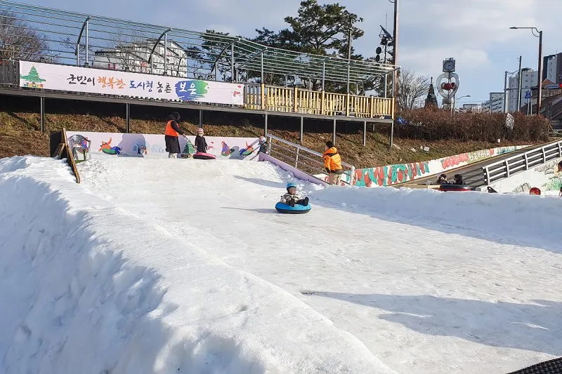 보은 보청천 하상주차장에는 무료 눈썰매장이 운영됩니다.