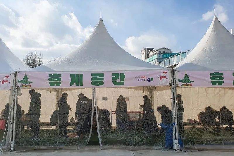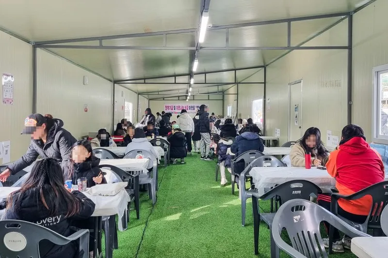 얼음썰매 옆 휴게공간에서는 제기차기도 하고 잠시 찬바람을 피할 수 있는 공간이 마련되어 있어요.
