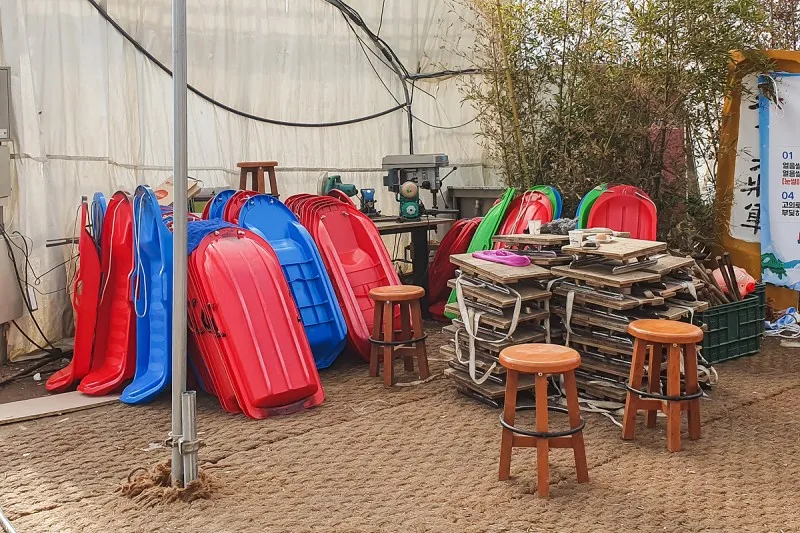 사용한 눈썰매는 어르신들께 그때그때 깔끔하게 닦아 주시고 썰매 이용권은 6,000원 이에요.