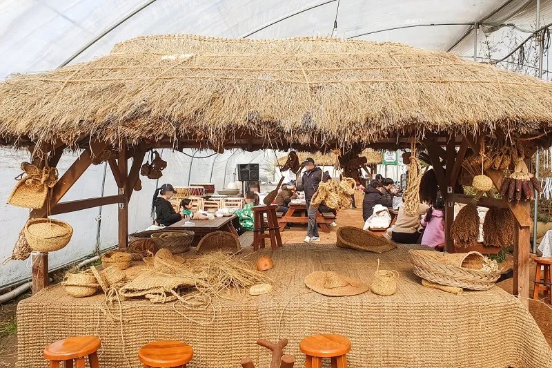 비닐하우스에서 다양한 농경체험이 가능한데 짚풀공예도 해볼 수 있어요.