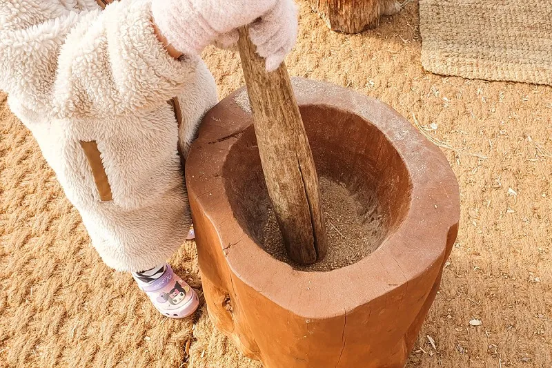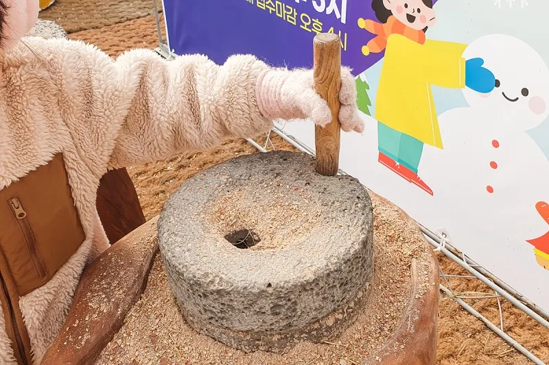 맷돌을 돌려보기도 하고 절구를 찧어보기도 하는데 눈썰매장을 이용하다가