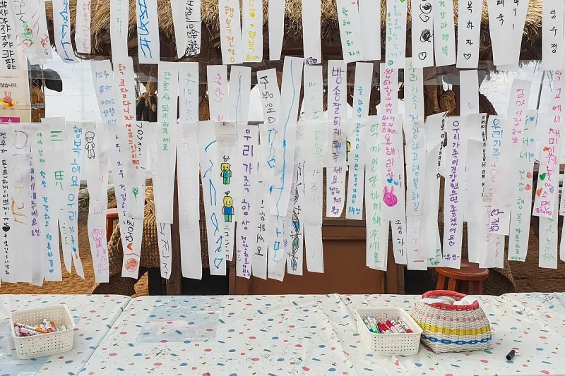 소원쪽지를 적는 공간도 있어요. 각자의 소원을 적어 걸어둘 수 있고 신나는 북을 쳐보기도 합니다.