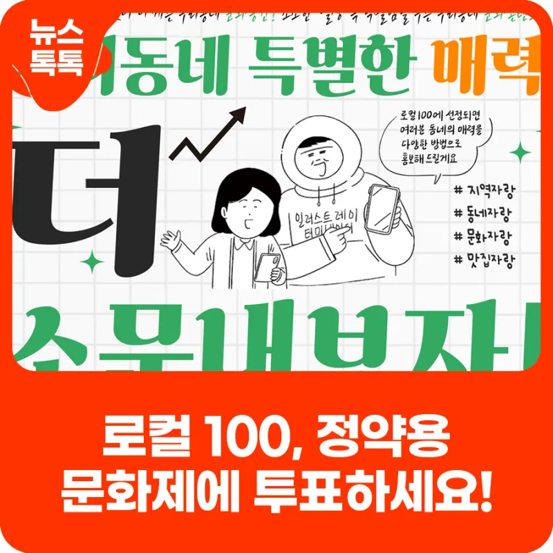제2기 로컬100 투표하기 투표확인 투표기간 10.1.(수) ~ 10.31.(금) 참여자격 국민 누구나! 투표하기 국민과 함께 만들어가는 진짜 매력, 대한민국 “로컬100”을 투표해주세요. 로컬100은 지역문화에 기반을 둔 특색있는 문화자원을 발굴·확산하는 사업입니다. 우리 지역과 동네를 대표할 수 있는 매력적인 문화자원에 대해 생각해 보는 것은, 지역의 가치를 발견하는 첫걸음입니다. 가족이나 연인, 친척 등 소중한 사람들과 함께 즐기고 싶은 문화자원도 떠올려 보세요. 다른 지역에 살고 있는 주민에게 우리 동네의 특별한 매력을...