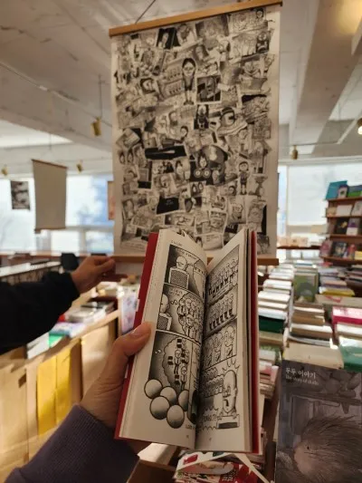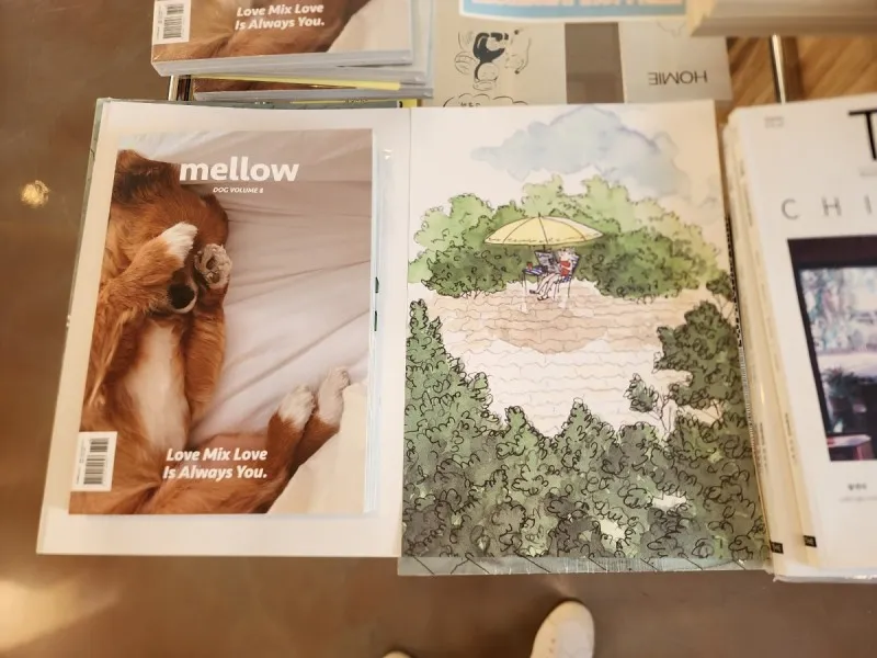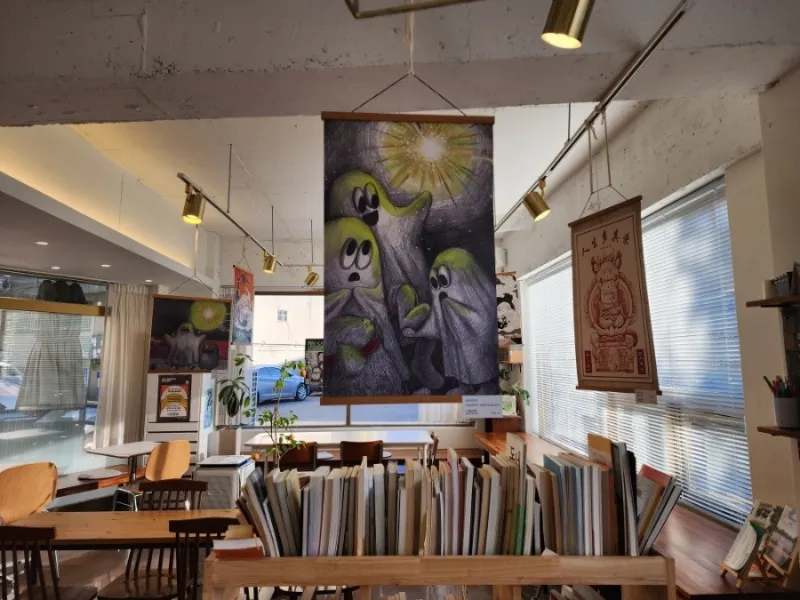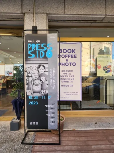 마침 제가 방문했을 때 독립출판 원화 전시를 하고 있었어요! 카페이면서, 서점이고, 전시장이 되기도 합니다! 또한 반려견 친화공간이면서, 사진관도 운영됩니다. 정말 흥미로운 공간이죠?