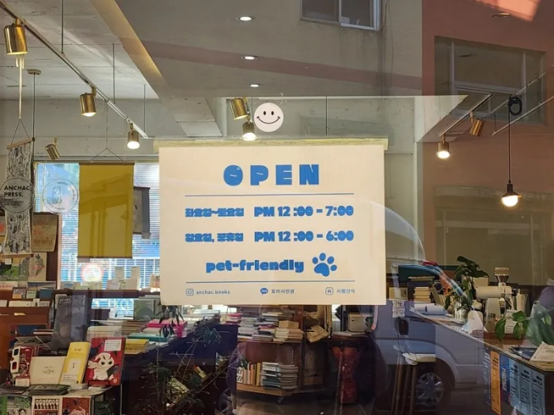 서점안착은 팻프랜들리 카페라서 반려견과 함께 방문할 수 있는 곳입니다. 평일에는 ‘호미’라는 카페 사장님의 반려견도 볼 수 있습니다. 이따 호미 사진 보여드릴게요!