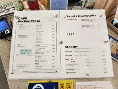 스페셜티 원두 핸드드립 커피도 있고 아메리카노와 라떼 등 커피류와 논커피류 등 다양한 음료메뉴와 간단한 디저트도 있습니다. 개인 텀블러 300원 할인도 가능하네요.