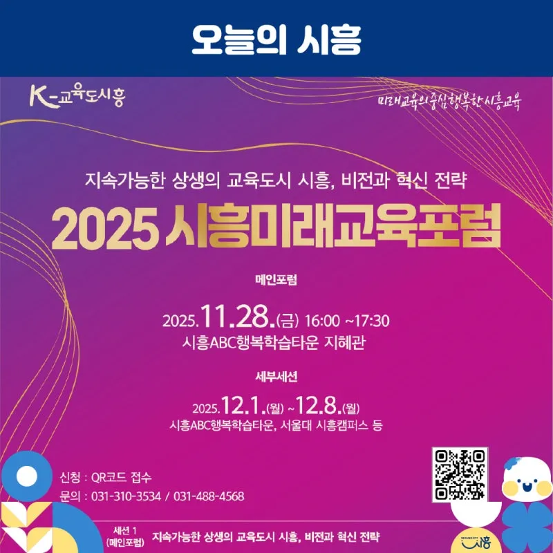 시흥시는 시흥교육지원청, 시흥시의회와 함께 오는 11월 28일부터 12월 8일까지 ‘2025 시흥미래교육포럼’을 진행합니다.