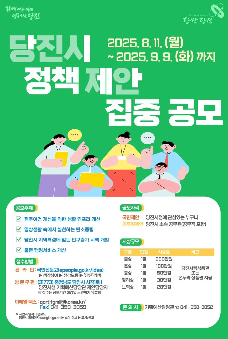 ① 온라인: 국민신문고(epeople.go.kr/idea) ▶ 생각참여 ▶생각모음 ▶ '당진' 검색 ② 방문우편: (31773) 충청남도 당진시 시청1로 1 당진시청 기획예산담당관 제안 담당자 ※ 접수는 공모기간 마감일 소인까지 유효함 ③ 이메일 팩스: qortjgml@korea.kr / Fax) 041-350-3059 ※ 제안서 양식 다운로드 당진시 홈페이지 ▶ 소식ㆍ정보 ▶ 고시/공고 |