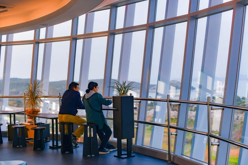 통유리로 되어있어 360도로 펼쳐지는 파노라마 뷰를 통해 색다르게 마주할 수 있는 태안 만리포해수욕장! 전망대 앞으로는 끝없는 푸른 바다가 펼쳐지고 뒤로는 웅장한 산세와 아담한 마을이 자리하고 있어 충남 여행지의 대조적인 아름다운 풍경을 한눈에 볼 수 있습니다.