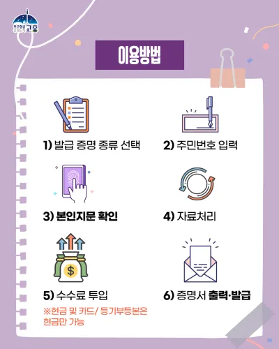 발급 받을 수 있는 민원서류 발급기로 각종 제증명을 발급받을 수 있습니다.
