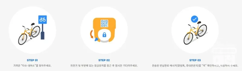 타슈 대여소에 갑니다. 타슈 어플을 실행한 후, 자전거 뒤쪽 잠금장치를 잠급니다. 카카오톡으로 반납 완료 메시지가 전송됩니다. **유의사항: 잠금장치가 제대로 잠기지 않거나 반납 메시지가 오지 않을 경우 반납이 완료되지 않았을 수 있으니 메시지를 반드시 확인하세요.