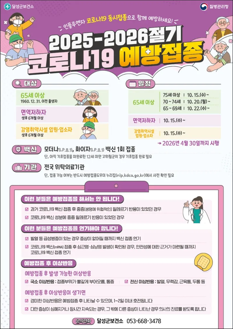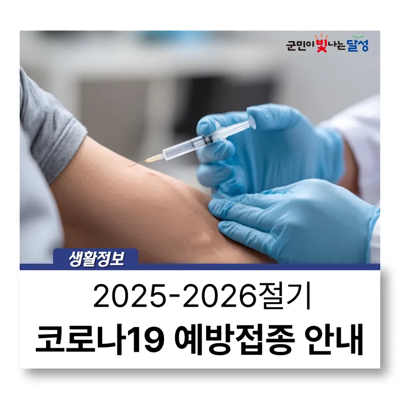 달성군은 2025년 10월 15일(수)부터 2026년 4월 30일(목)까지 '2025-2026절기 코로나19 예방접종'을 실시합니다