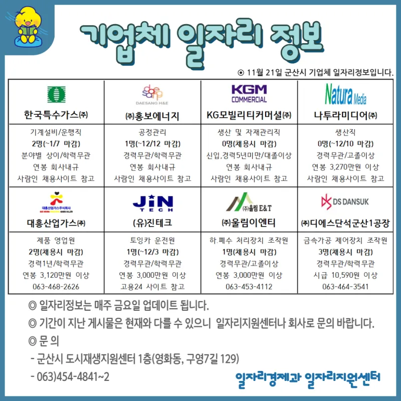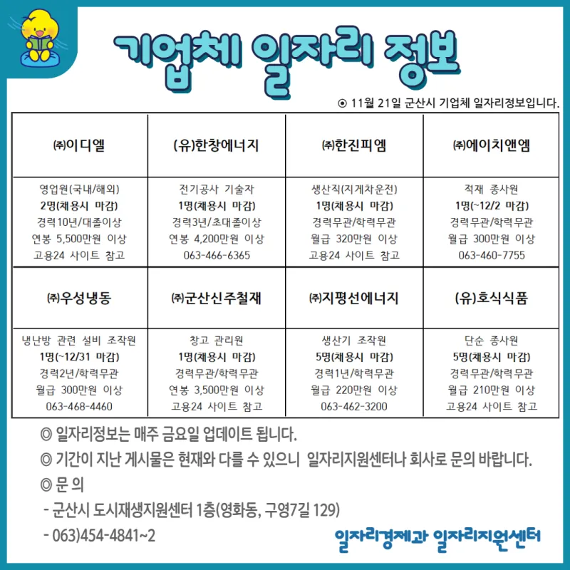 군산시 기업체 일자리 정보(11. 21.)