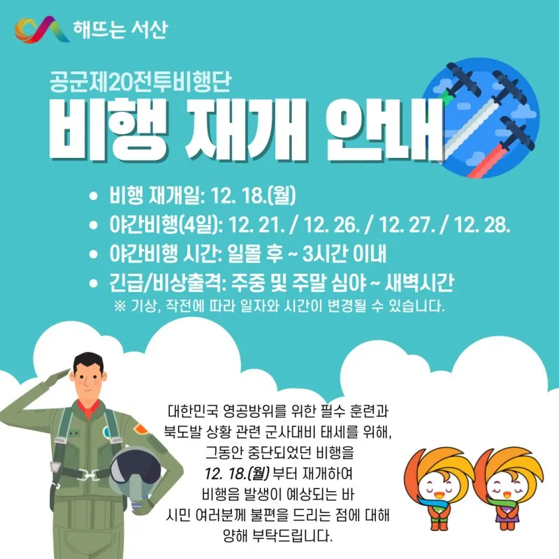 {"title":"공군 제20전투비행단 비행 재개 안내","source":"https://blog.naver.com/seosan_city/223293821033","blogName":"서산시 공..","blogId":"seosan_city","domainIdOrBlogId":"seosan_city","logNo":223293821033,"smartEditorVersion":4,"meDisplay":true,"blogDisplay":true,"lineDisplay":true,"outsideDisplay":false,"cafeDisplay":true}