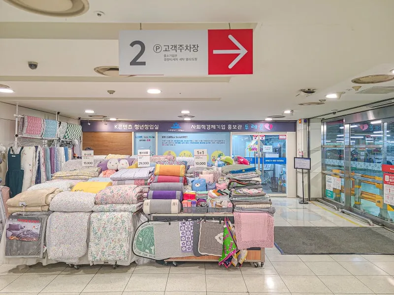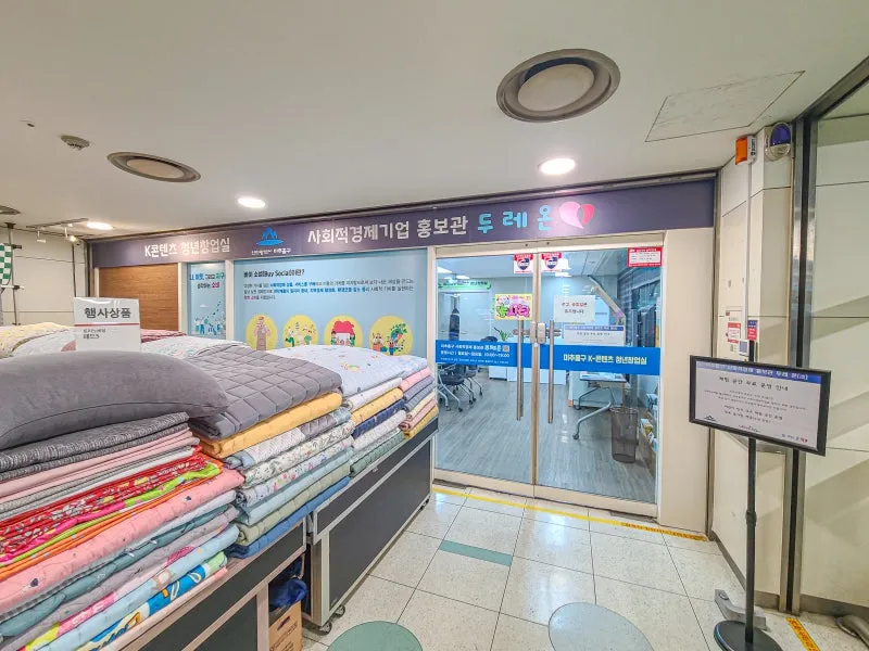 에스컬레이터 타는 곳 끝 쪽으로 오면 행사 상품 진열되어 있는 곳 뒤에 K-콘텐츠 청년창업실 들어가는 공간이 있습니다.