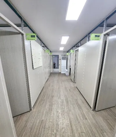앞쪽으로 오면 미추홀구 K-콘텐츠 청년창업실 입구와 복도가 나옵니다. 201호부터 205호까지 있으며 현재 205호 입주자를 모집하고 있습니다. 임대료, 공공요금 전액 지원이며 사무기기, 인터넷, 촬영 스튜디오 장비 및 회의실 등을 제공해 줍니다. 대상은 인천시에 주민등록된 18세~39세 이하 콘텐츠산업 분야 예비창업자 및 창업 후 3년 이내 초기 창업자입니다.