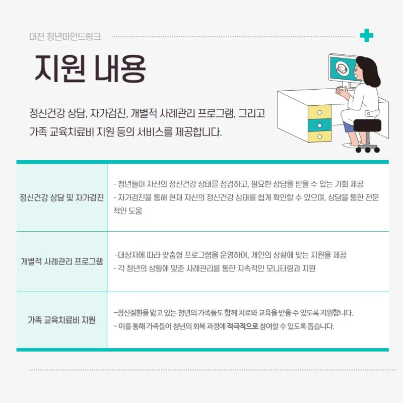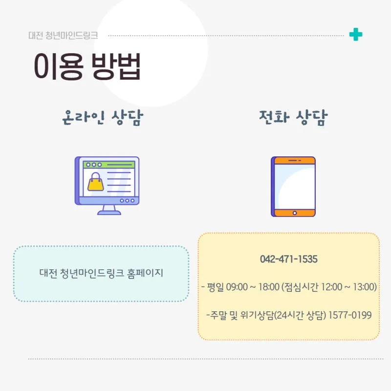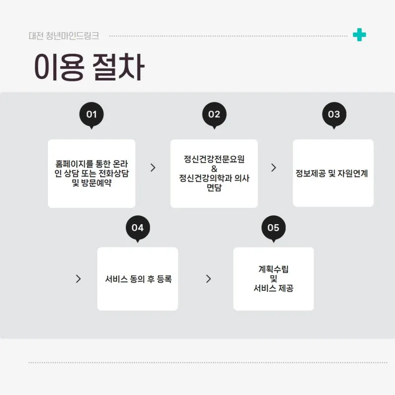 - 방문 시, 대전 청년마인드링크와 대전광역정신건강복지센터에서 상담과 신청이 가능합니다.