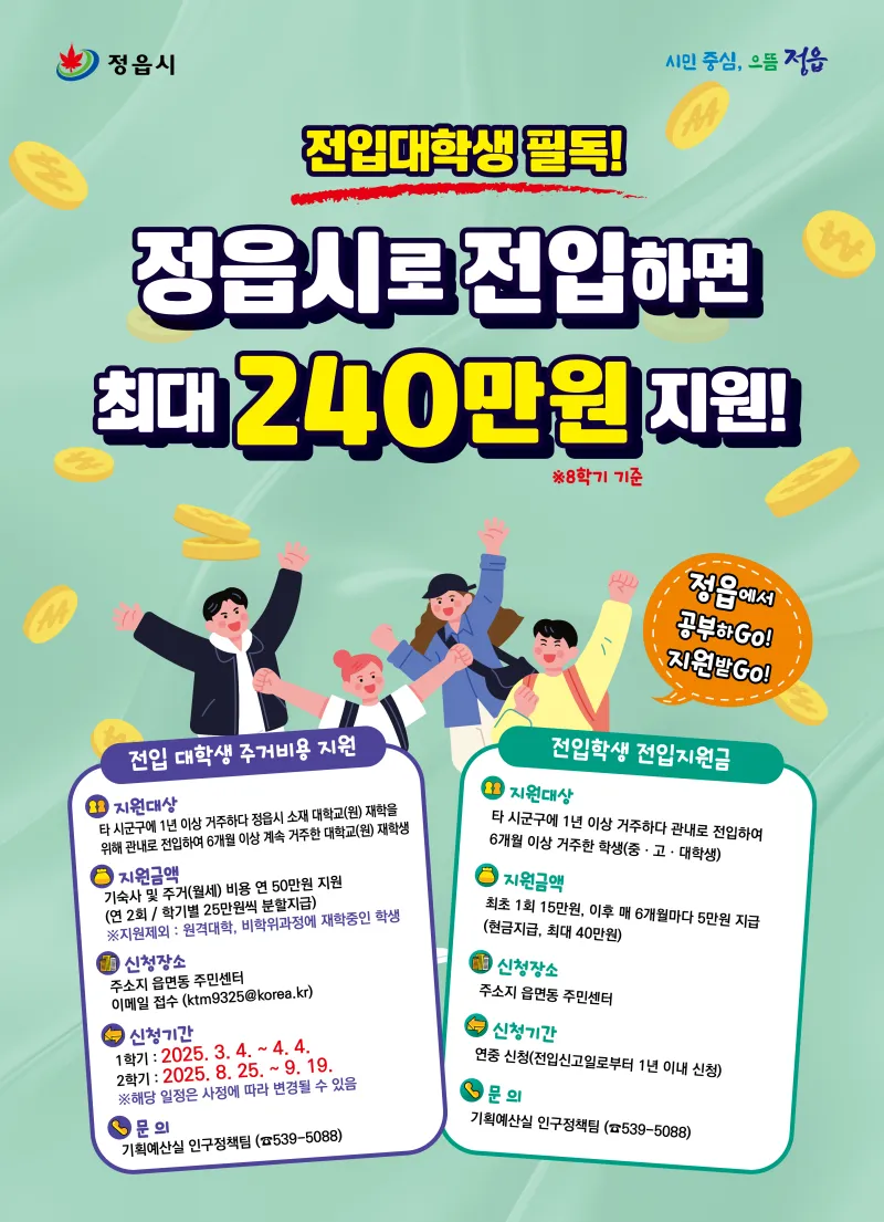 2025년 상반기 정읍시 전입대학생 거주비용 지원 | ~4. 4.(금)