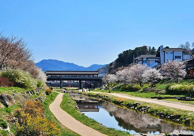 연분홍빛 꽃잎이 가지마다 가득 피어 있고, 그 아래로는 제민천이 잔잔히 흐르고 있어요.