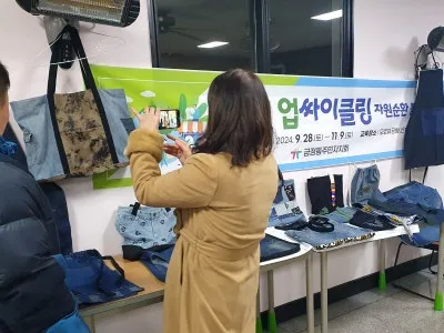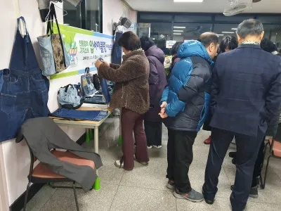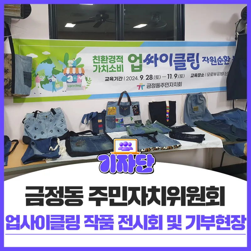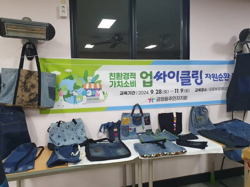 더 나은 마을을 만들기 위한 노력 중 하나로 금정동 주민자치위원회에서는 업사이클링을 활용하여 가방, 바지 등을 만들어 전시회를 진행하고, 홀로 지내시는 어르신들을 위한 따뜻한 의류를 지원했습니다. 업사이클링은 쓸모가 없어져 버려지는 제품을 단순히 재활용하는 차원을 넘어서 친환경적인 디자인이나 아이디어, 기술 등의 가치를 부가하여 새로운 제품으로 재탄생 시키는 활동을 말하는데요.