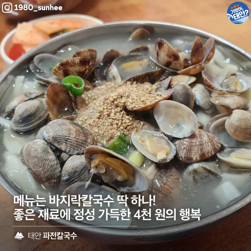 메뉴가 바지락칼국수 딱 하나만 있는 태안 서부시장 맛집이 있습니다. 바로 가성비 맛집으로 유명한 태안 파전칼국수인데요. 바지락이 왕창 들어간 푸짐한 바지락칼국수를 4천 원에 팔고 있는 가성비 넘치는 곳으로 현지인들이 많이 방문하고 추천하는 태안 서부시장 맛집 중 하나입니다. 행정안전부 선정 착한가격업소에 선정되어 믿고 방문하실 수 있습니다.