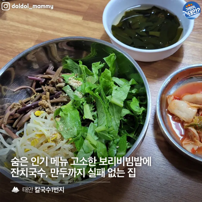 태안 서부시장 맛집 칼국수1번지에선 바지락칼국수 말고도 숨겨진 인기 메뉴가 있는데, 바로 보리비빔밥입니다. 상추와 고사리, 콩나물 등 다양한 채소가 들어간 고소한 보리비빔밥과 함께 잔치국수와 만두를 곁들여 드시는 것을 추천해 드립니다.