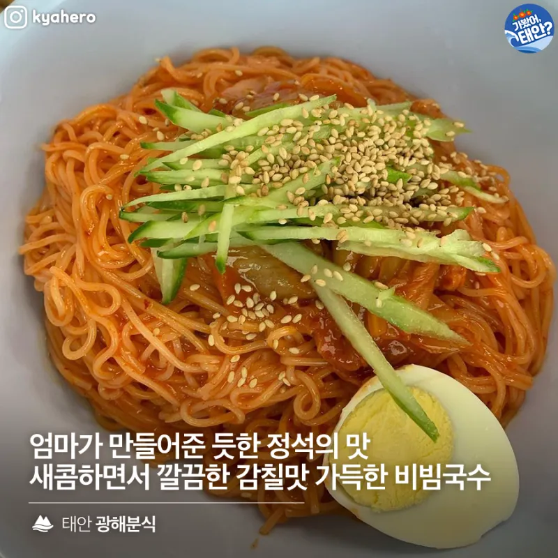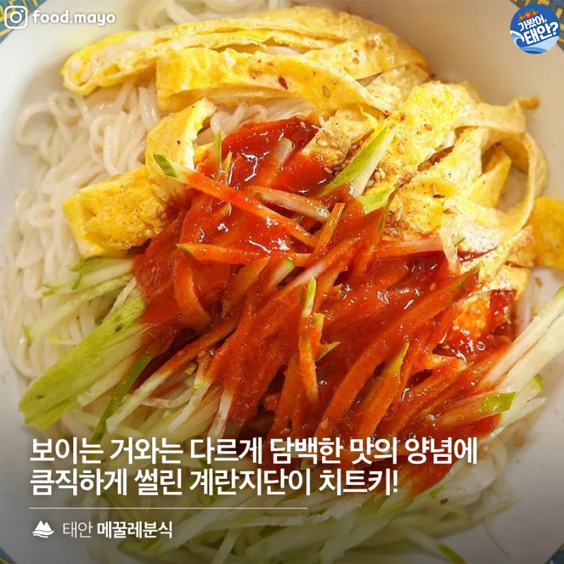 담백한 소스로 유명한 비빔국수는 태안 서부시장 맛집 메꿀레분식의 시그니처 메뉴입니다. 단돈 6천 원에 푸짐한 계란지단이 더해져 있는 비빔국수는 저렴한 가격 덕분에 가성비가 넘치는 태안 최고의 가성비 맛집 중 하나입니다.