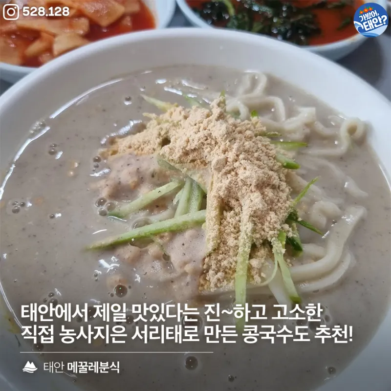 직접 농사지은 서리태로 만든 태안 서부시장 맛집 메꿀레분식의 콩국수는 진하고 고소한 국물이 일품인 메뉴입니다. 식객 허영만 선생님도 방문하셔서 극찬을 아끼지 않으신 태안의 순수한 맛이 담긴 곳입니다.