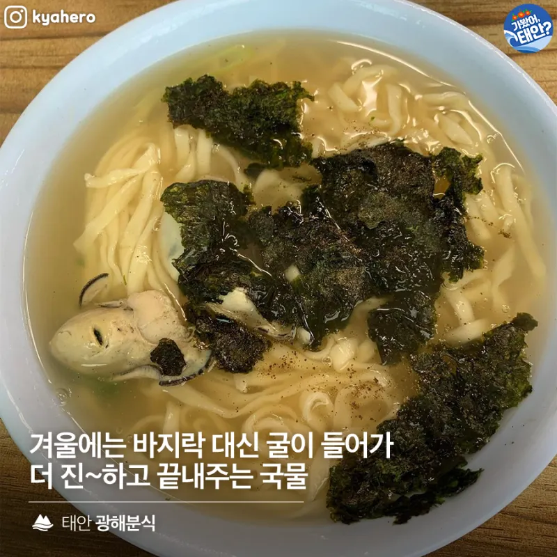 겨울철 제철 음식으로 유명한 굴! 굴전, 굴보쌈, 석화구이 등 굴을 이용한 음식들은 정말 많은데요! 태안 서부시장 맛집 광해분식에는 조금은 생소한 메뉴가 있습니다. 바로 굴로 만든 굴 칼국수로, 겨울에는 바지락 대신 굴이 들어가 더 깊고 진한 국물이 인상적입니다. 굴로 만든 이색 칼국수를 맛볼 수 있는 가성비 맛집 광해분식을 꼭 들러보세요!