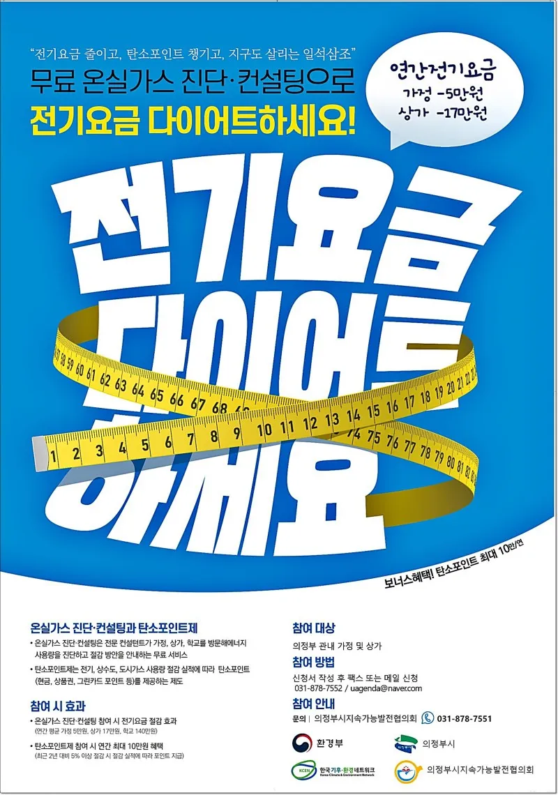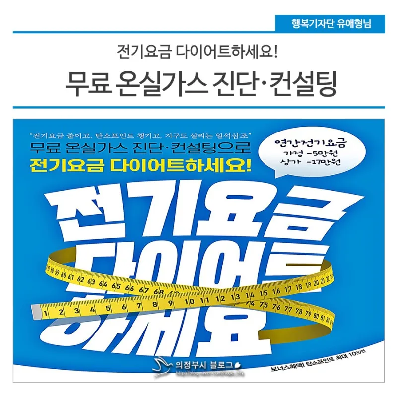 의정부시(기후에너지과)에서는 관내 가정 및 상가를 대상으로 에너지사용요금 절감을 도와주는 <무료 온실가스 진단·컬설팅>을 해드립니다.