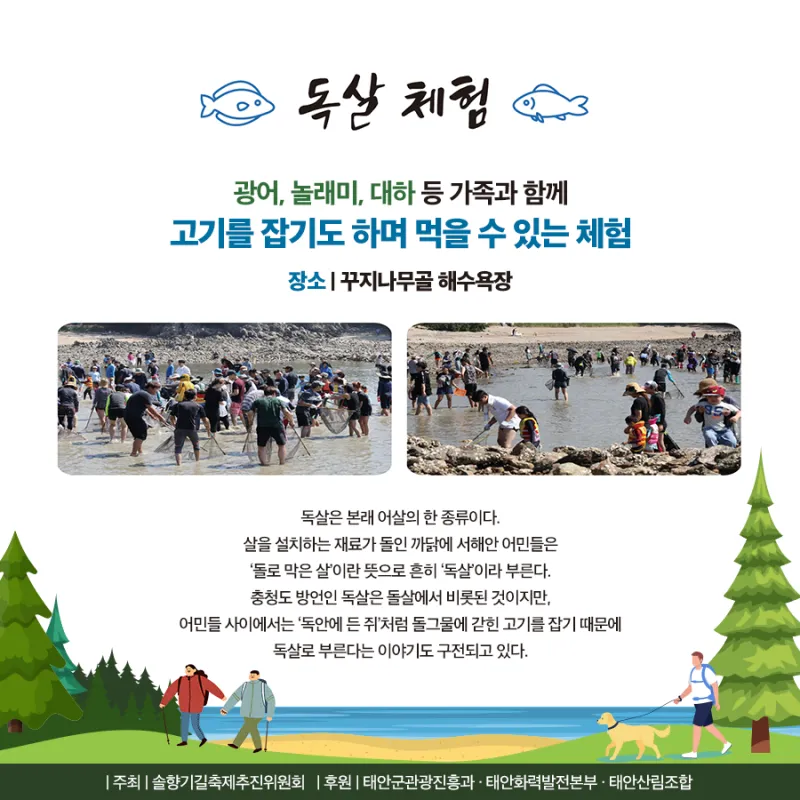 서해바다와 솔내음 솔솔 풍기는 소나무 숲 사이의 솔향기길 트레킹, 해변에서 진행되는 독살체험을 통해 직접 고기 잡고 맛보고 이벤트 참여까지!