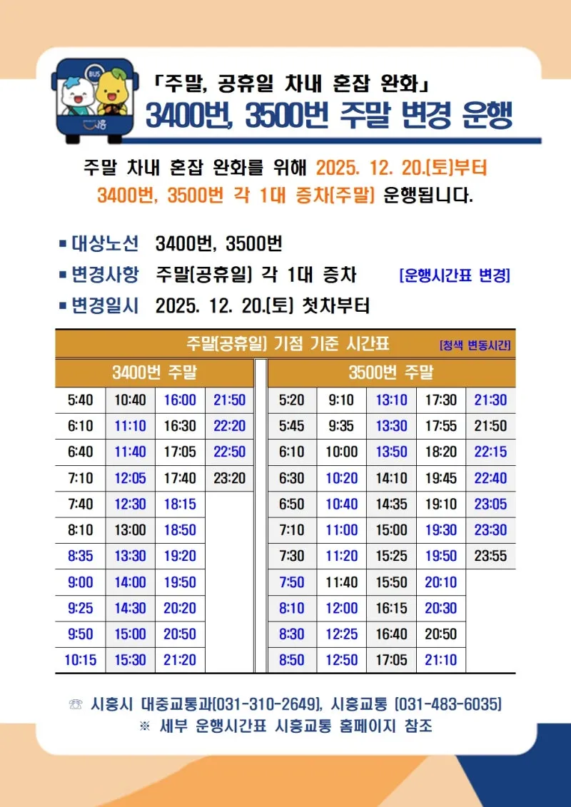 「주말, 공휴일 차내 혼잡 완화」 3400번, 3500번 주말 변경 운행