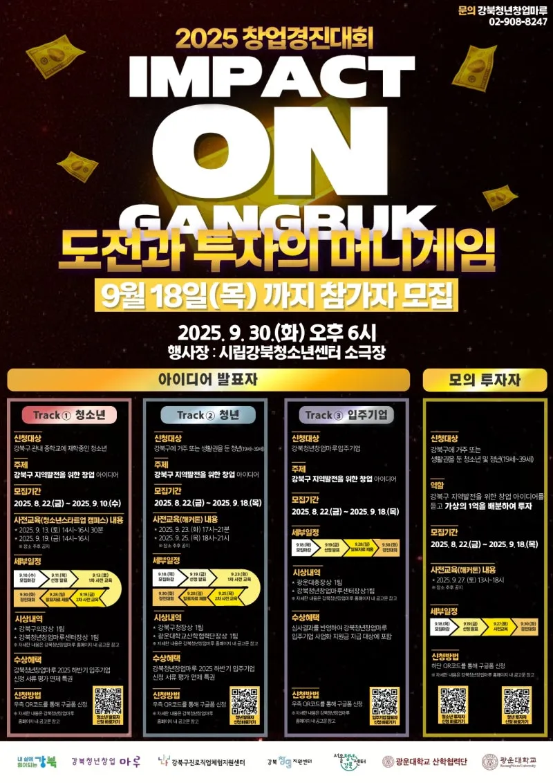 안녕하세요. 강북청년창업마루입니다. 강북청년창업마루에서는 강북구 관내 (예비) 창업 기업의 경쟁력 강화 등 기업의 성과 창출을 위한 아이디어 검증 및 기회 구축 프로그램의 필요성에 따라 창업 경진대회 (IMPACT ON 강북 : 도전과 투자의 머니게임)을 개최하오니 많은 관심과 참여 부탁드립니다. ❏ 일시 : 2025.9.30.(화) 18:00 ~ 20:50 ❏ 장소 : 시립강북청소년센터 소극장(서울 강북구 4.19로 74 시립강북청소년센터) ❏ 대상 ① 강북구 내 거주 또는 강북구 관내 학교에 재학중인 청소년 ② 강북구 내 거주하...
