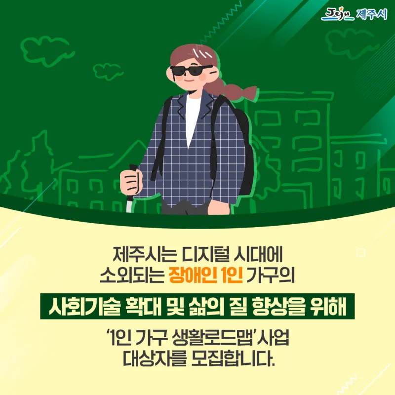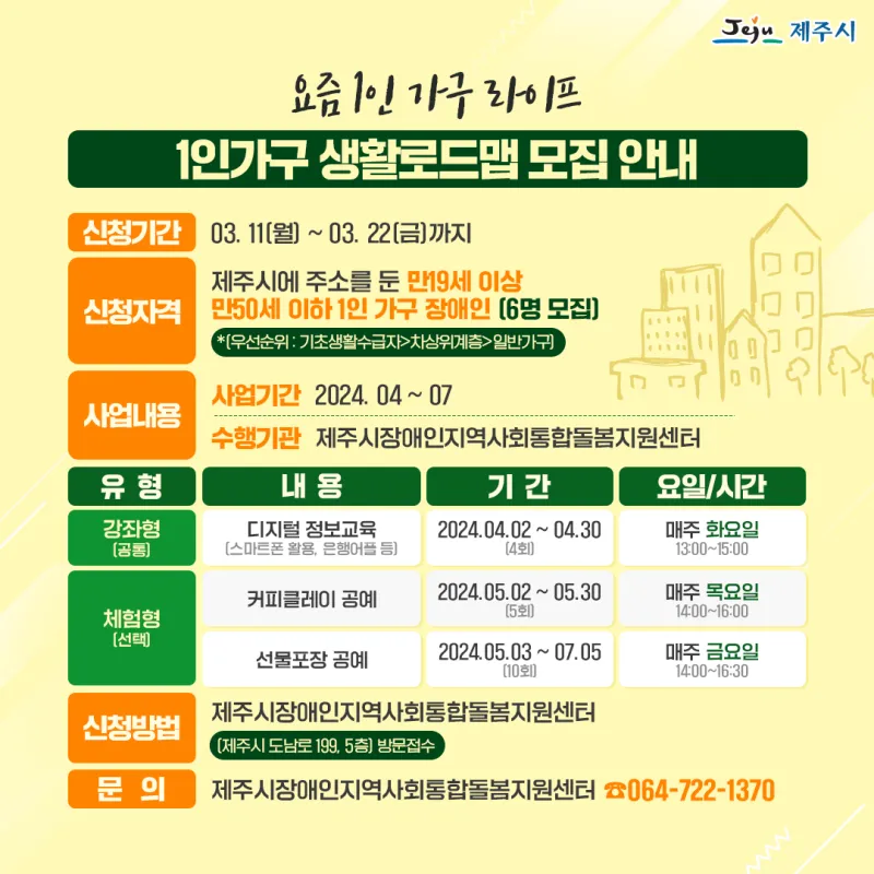 제주시에 주소를 둔 만19세 이상 만50세 이하 1인 가구 장애인 (6명 모집) *(우선순위: 기초생활수급자>차상위계층>일반가구) |