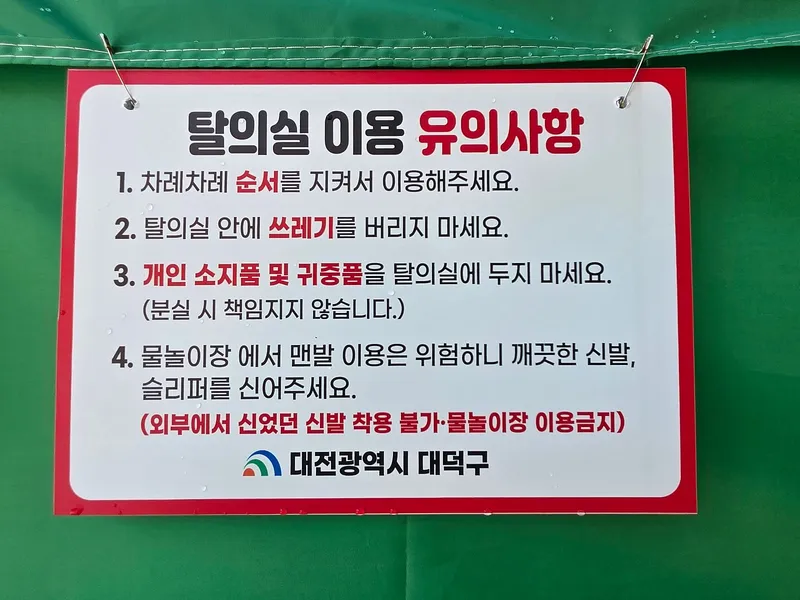 탈의실을 마련하여 옷을 갈아입고 자유롭게 물놀이를 즐길 수 있습니다. 탈의실 이용 시 유의사항을 잘 읽어보는 것도 잊지 말아 주시길 바랍니다. 화장실은 기존 공원을 활용하기 때문에 잘 갖춰져 있습니다. 이 점도 물놀이장을 이용하는 데 큰 장점이 아닌가 싶습니다.