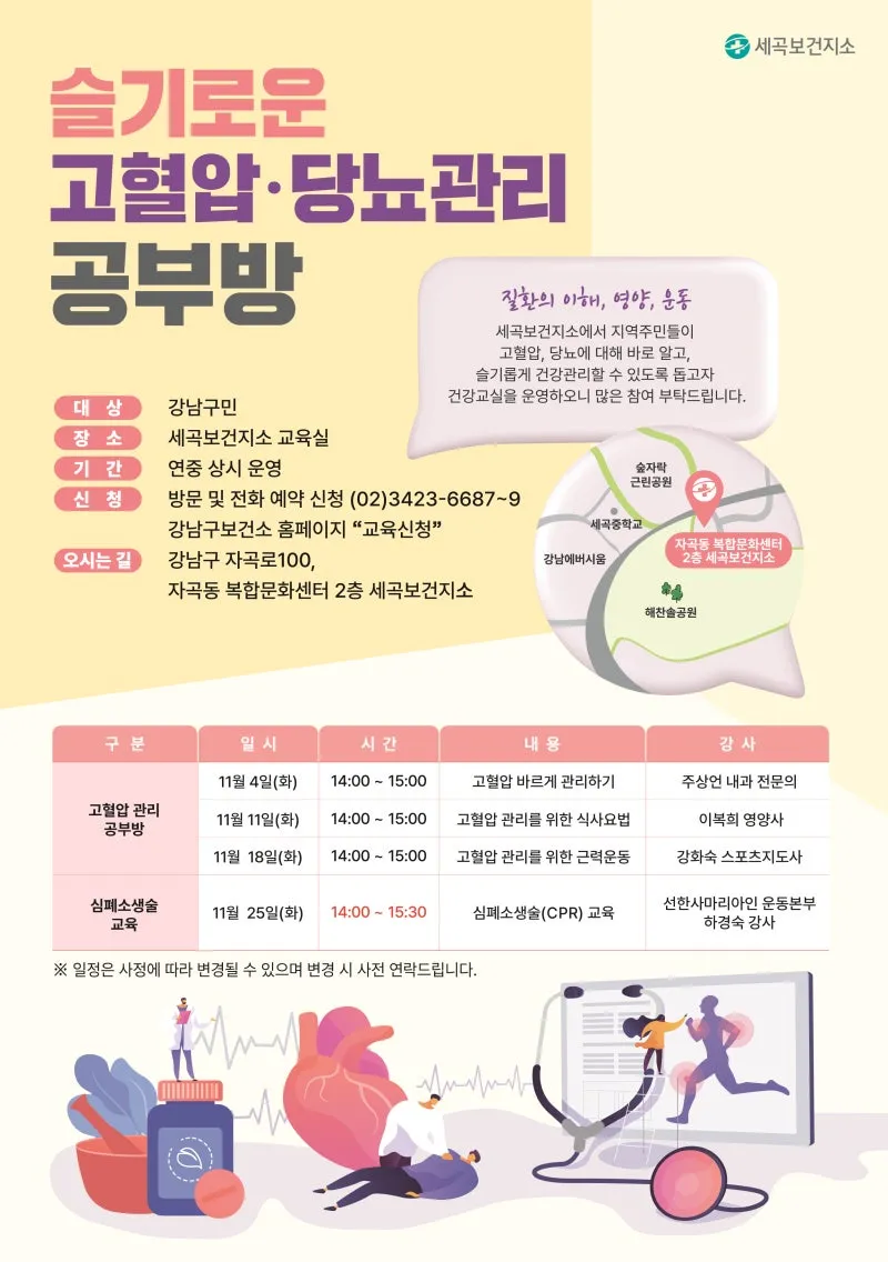 세곡보건지소 11월 슬기로운 고혈압·당뇨관리 공부방 일정 안내드립니다~