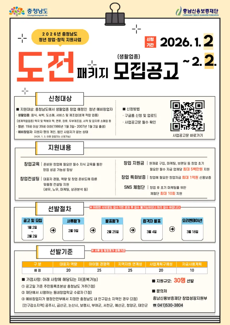 2026년 충청남도 청년 창업·창직 지원사업 📢도전패키지 모집공고(생활업종)