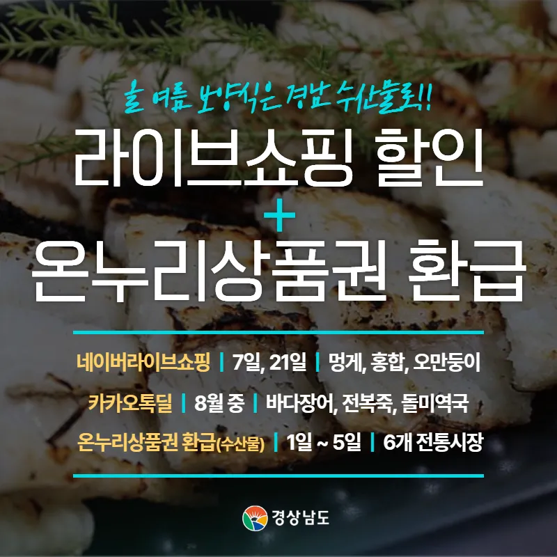 올여름 보양식은 경남 수산물로 !! 라이브쇼핑부터 전통시장까지 혜택 풍성 !! - 온라인기획전 , 온누리상품권 환급까지 .. 도민 · 소비자에게 실질적 혜택 제공 네이버 · 카카오 등 온라인 플랫폼을 통한 수산물 할인 기획전 추진 8 월 1 일부터 5 일까지 , 도내 6 개 시장에서 온누리상품권 환급행사 시작 경상남도 ( 도지사 박완수 ) 는 여름철 건강한 식생활과 지역경제 활성화를 위해 수산물 소비 촉진 행사를 온오프라인에서 다양하게 추진한다 . 이번 행사는 장어 , 문어 , 멍게 , 홍합 등 단백질이 풍부한 보...