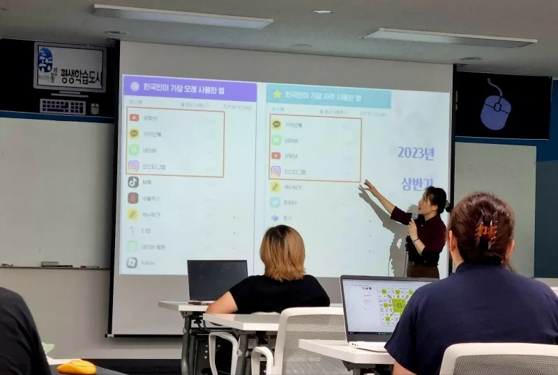 디지털 교육이 필요한 이유로 통계자료를 참고해 보면서 수업의 시작을 열었습니다. 여러 가지 데이터를 기반으로 한 통계도 확인해 보는 시간을 가져보았는데, 누구나 한번쯤은 관심이가 가는 통계자료였습니다. 한국인이 가장 많이 사용한 앱은 카카오톡이고, 2023년 상반기동안 가장 많이 성장안 앱은 토스라고 합니다. 한국인이 가장 오래 사용한 앱과 한국인이 가장 자주 사용한 앱은 네이버, 카카오톡, 유튜브, 인스타그램이라고 합니다.