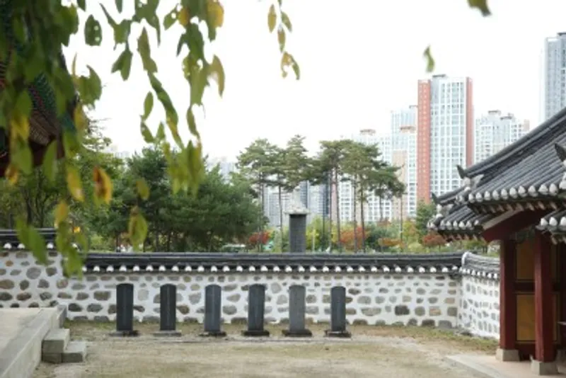 송산사 부근은 잔디광장에 비해 많이 한적합니다. 저는 이곳에서 향나무를 보는 것을 좋아하는데요. 5섯 그루의 향나무가 마치 한 그루처럼 보이는 것도 신기하고요. 늘 푸른 모습으로 서 있는 향나무의 지조도 본받고 싶답니다. 사당 언덕에서 홍살문 쪽으로 보는 광경도 멋집니다. 높은 고층건물과 전통건축물이 한데 어우러진 느낌이 좋습니다.