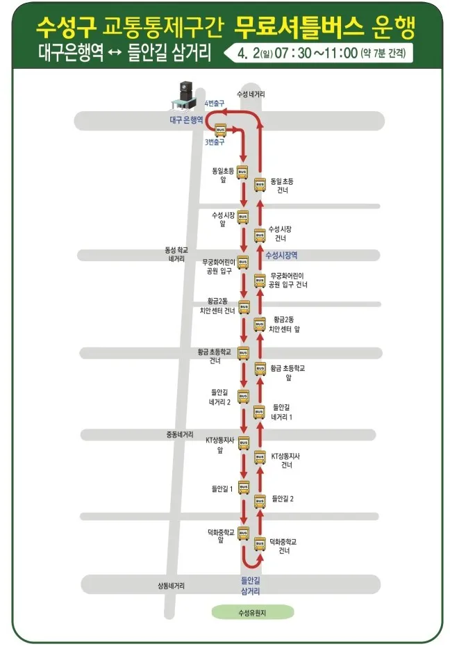 국보공원 → 청구네거리 → 수성네거리 → 범어네거리→ 두산오거리 → 상동네거리 → 상동시장 네거리 → 상동교 → 신천동로 진입(역방향) → 대산초(반환) → 동신교 → 종각네거리(Finish) |