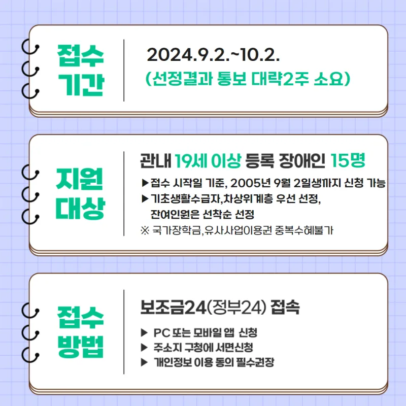 관내 19세 이상 등록 장애인 15명 (접수 시작일 기준, 2005년 9월 2일생까지 신청 가능) (기초생활수급자, 차상위계층 우선 선정, 잔여인원은 선착순 선정) ※국가장학금, 유사사업 이용권 중복 수혜 불가 |