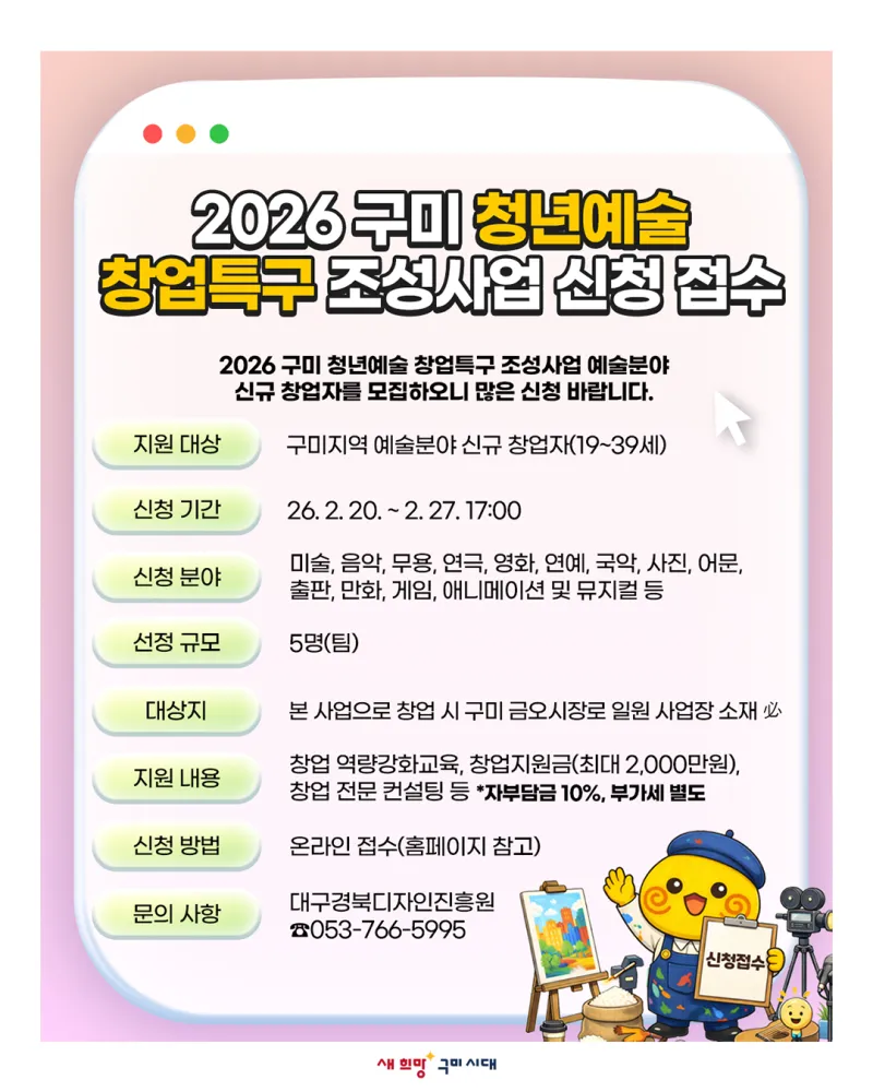 2026 구미 청년예술 창업특구 조성사업 예술분야 신규 창업자를 모집하오니 많은 신청 바랍니다.