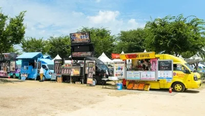 푸드트럭들이 줄지어 있으며,