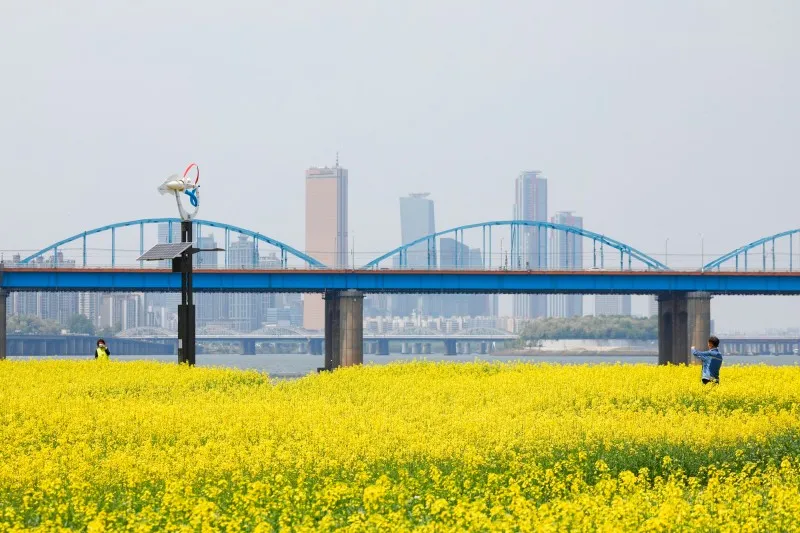 섬을 가득 물들이는 꽃과 한강을 배경으로