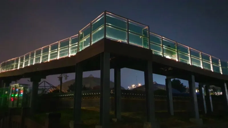 달전천생태탐방로 4구간의 끝은 자라섬캠핑장인데요. 이곳에서 직진하여 자라섬 산책코스를 이용하셔도 되지만 저는 이화원 앞의 오르막길을 따라 달전천을 가로지르는 생태문화교를 건너 가평역방향으로 이동하는 것으로 취재를 마무리지어보았습니다(원래는 자라섬출렁다리를 건너 자라섬서도까지 이동할 생각이였지만 자라섬출렁다리는 이전에도 다녀왔고 다른 후기도 많아 생략하게 되었습니다.) 생태문화교로 올라가는 경사로는 다른 곳보다 조명이 약해 야간 방문시 약간의 불편이 있을 것으로 보였지만, 이곳은 사람이 지나다니지 않을 때에는 가장 낮은 밝기로 점등되었다가 사람이 지나가면 센서가 작동하여 이동하는 발걸음에 따라 불이 환하게 켜지는 특별한 조명이 설치되어있어 신기했는데요. 여러분들도 안전하고 걷기좋은 달전천생태탐방로에서 봄나들이 야간 산책을 즐겨보시길 바라며 이상 글을 마칩니다.