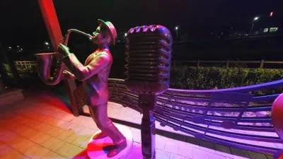 자라섬재즈길은 가평고등학교 옆 오목교를 시작으로 매년 자라섬재즈페스티벌이 개최되는 자라섬남도 방향을 따라 조성된 특별한 테마공원겸 걷기 코스로서 이 길을 따라 걷다보면 역대 재즈페스티벌 주요참가자들의 핸드프린팅과 명단 등이 새겨진 동판들이 바닥 곳곳에 조성되어 있는 것을 확인하실 수 있습니다. 달전천생태하천탐방로는 저 멀리 하색리부터 시작되지만 시내와 가깝고 전 구간을 걸쳐 가장 걷기 좋은 코스는 이곳 자라섬재즈길 한켠에 조성된 재즈공원에서부터 출발하는 것이 좋은데요. 본격적인 탐방로 진입에 앞서 공원 곳곳에 조성된 조형물과 야간조명을 구경하며 잠시 스트레칭도 즐겨보시고 커다란 전축에 블루투스를 연결하여 노래도 들어보는 등의 시간을 보내보시는것을 추천드립니다.(조형물에 설치되어 있는 스피커에 블루투스로 연결하는 방법은 옆 설명판에 자세하게 안내되어있으니 참고해주시길 바랍니다.)