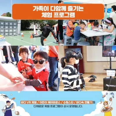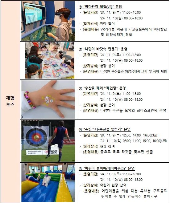 · 체험부스 운영(바다환경 VR체험, 슈팅스타-수산물 맞추기 등) · 소상공인 플리마켓, 어린이낚시 대회(3회 11:00, 12:00, 15:00) |