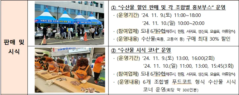 · 조합별 수산물 할인 판매행사(~20:00) · 수산물 시식코너(3회, 11:00/13:00/16:00) · 수산물 잡기대회(2회, 13:00/16:00) 선수 사인회(15:00) 등 |