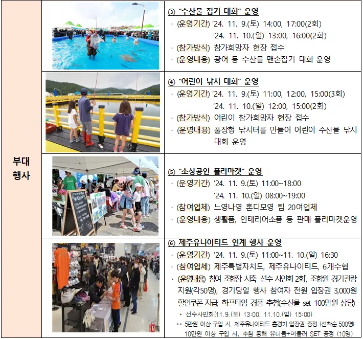 · 수산물 시식코너(2회, 13:00/16:00) · 수산물 잡기대회(2회, 14:00/17:00), 선수 사인회(13:00) 등 |